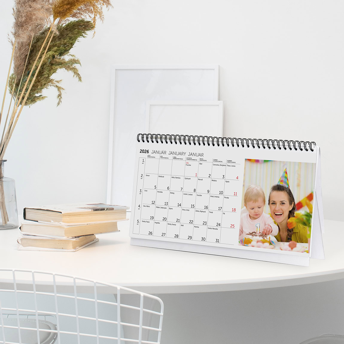 Vidd magaddal kedvenc képeidet, szeretteidet az irodába ezzel a nagyszerű asztali naptárral! A naptár részét nagyszerűen használhatod a munkád során, bőven van helyed a fontos események lejegyzésére. Nyomon tudod követni a napi információkat, miközben feldobja a napodat minden előtted megjelenő kép, csodálatos emlék! Csupán 13 kedvenc képpel már pillanatok alatt megszerkeszthető a naptárad!